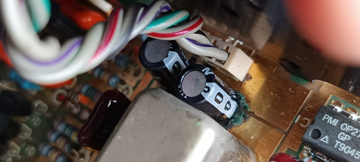 It arrived at our workshop with severe crackling noise in one channel of the phono section. Upon opening the unit for inspection, we discovered several leaking electrolytic capacitors, which had spread corrosive residue over the PCB traces and even damaged some of them.